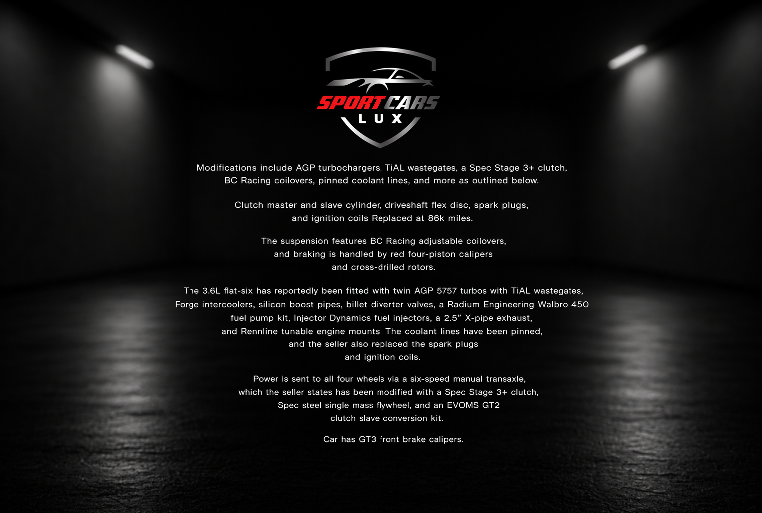 Modifications include AGP turbochargers, TiAL wastegates, a Spec Stage 3+ clutch, BC Racing coilovers, pinned coolant lines, and more as outlined below Clutch master and slave cylinder, driveshaft flex disc, spark plugs, and ignition coils Replaced at 86k miles. The suspension features BC Racing adjustable coilovers, and braking is handled by red four-piston calipers and cross-drilled rotors. The 3.6L flat-six has reportedly been fitted with twin AGP 5757 turbos with TiAL wastegates, Forge intercoolers, silicon boost pipes, billet diverter valves, a Radium Engineering Walbro 450 fuel pump kit, Injector Dynamics fuel injectors, a 2.5” X-pipe exhaust, and Rennline tunable engine mounts. The coolant lines have been pinned, and the seller also replaced the spark plugs and ignition coils. Power is sent to all four wheels via a six-speed manual transaxle, which the seller states has been modified with a Spec Stage 3+ clutch, Spec steel single mass flywheel, and an EVOMS GT2 clutch slave conversion kit. Car has GT3 front brake calipers.